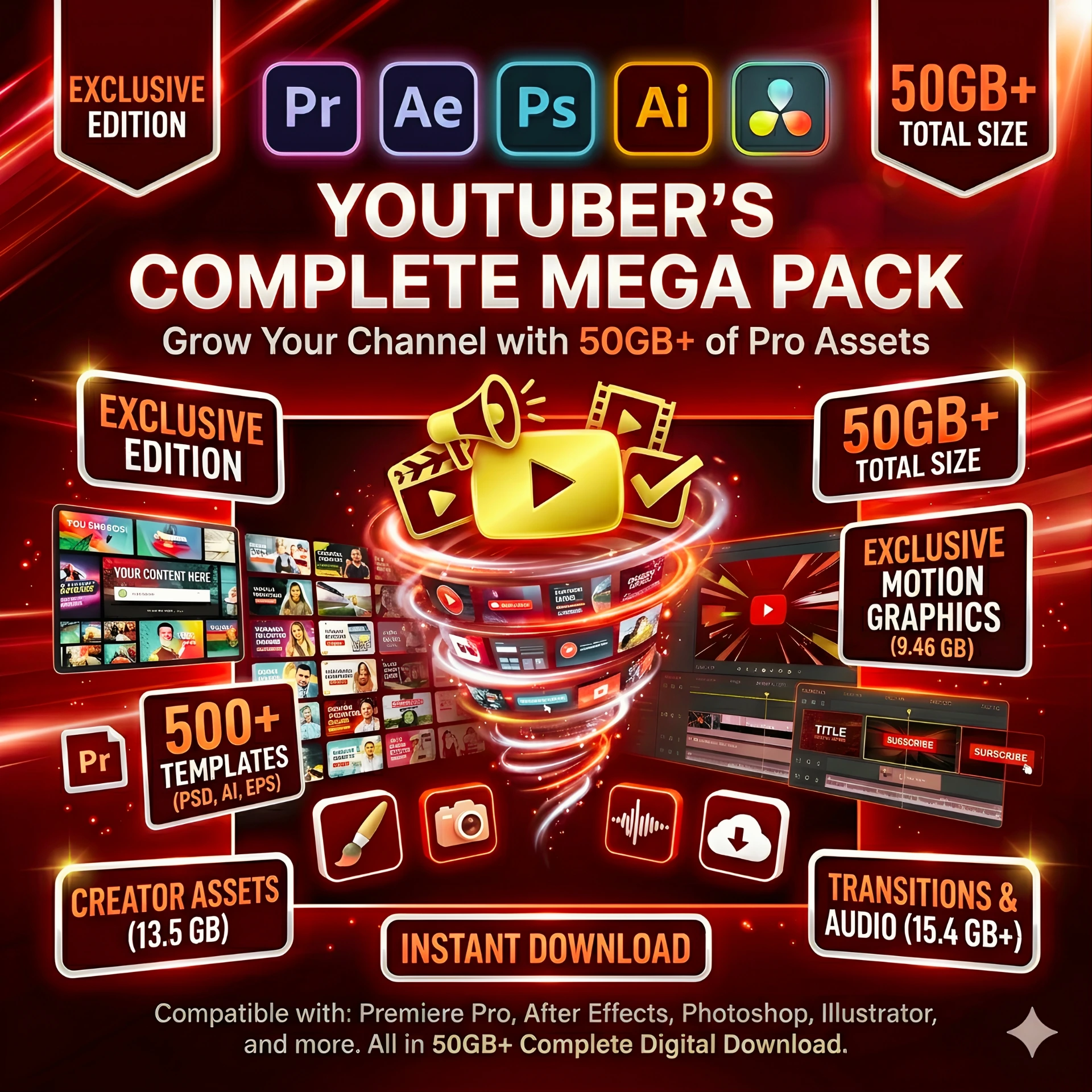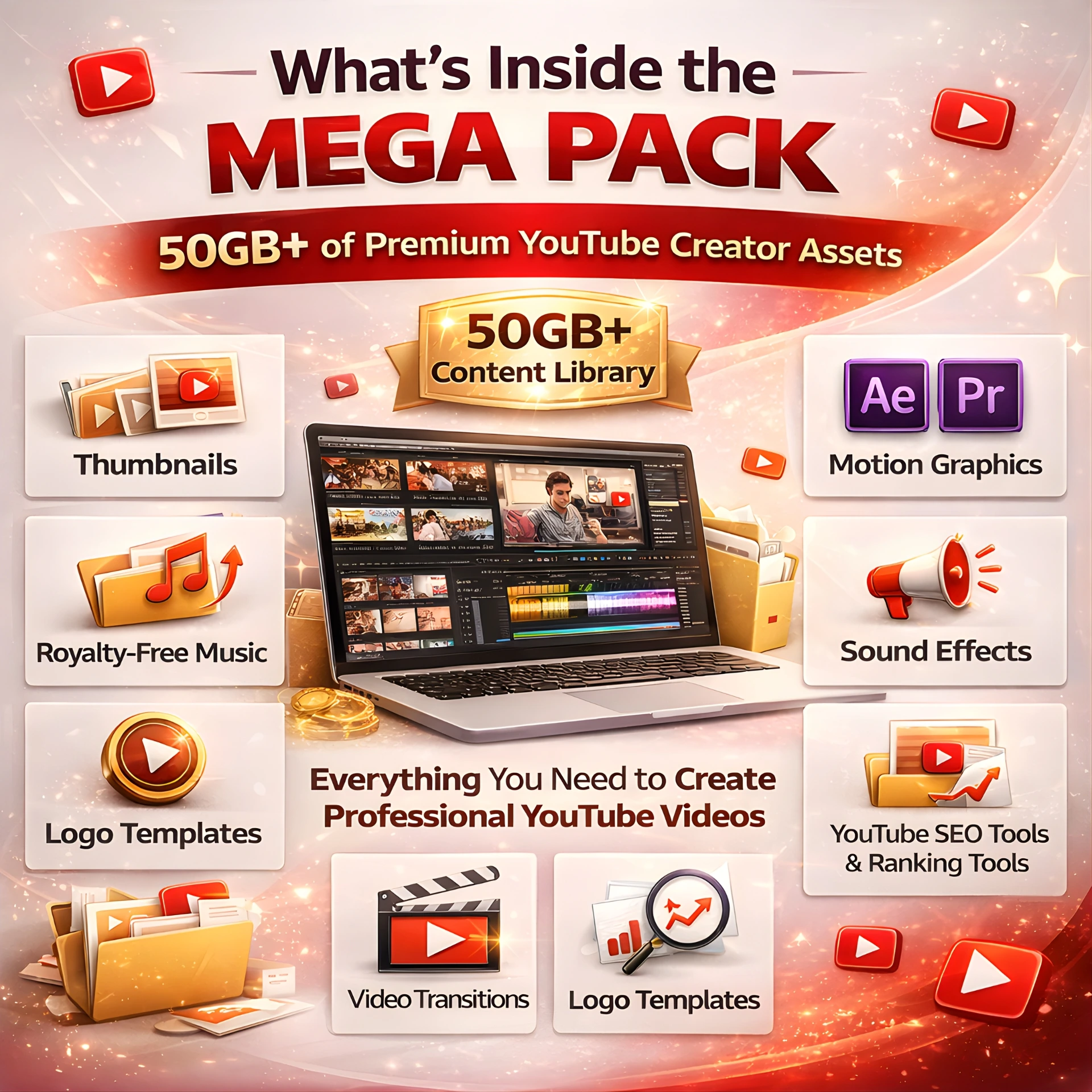 The YouTuber’s Complete Mega Pack is your ULTIMATE growth system, packed with 50GB+ of premium creator assets designed to help you create professional content, boost engagement, and accelerate your channel growth.